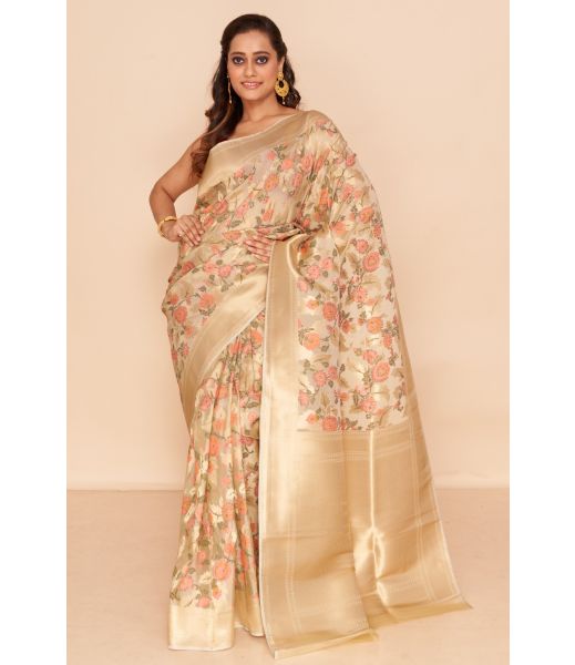 ALL OVER FLORAL WORK ON PASTEL GREEN ORGANZA, MATCHING BROCADE BLOUSE PIECE