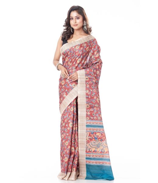ALL OVER KALAMKARI PRINT ON SILK SAREE, CONTRAST PALLU & BORDER, CONTRAST BLOUSE PIECE