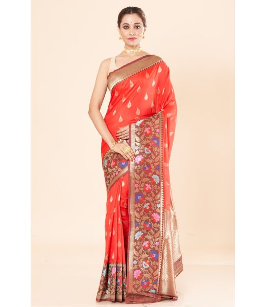 Color: Radiant red body with golden zari work and vibrant multicolored border and pallu