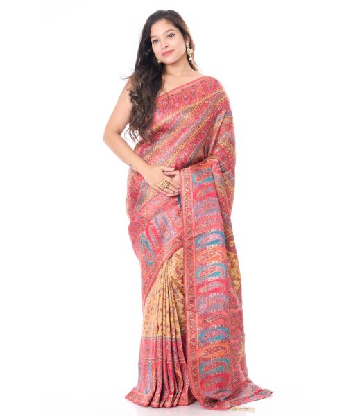 - Border and Pallu: Vibrant pink border with bold paisley motifs in teal and orange hues, accented with fine zari work for a luxurious finish.
