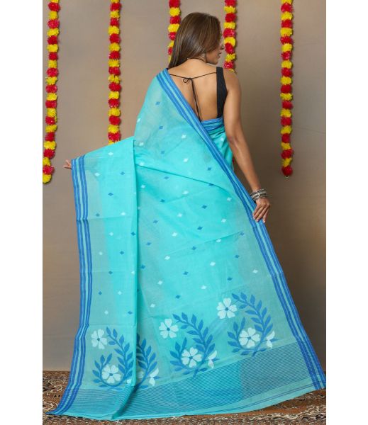 Design: Sky blue base with intricate Jamdani thread motifs on the body and pallu