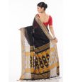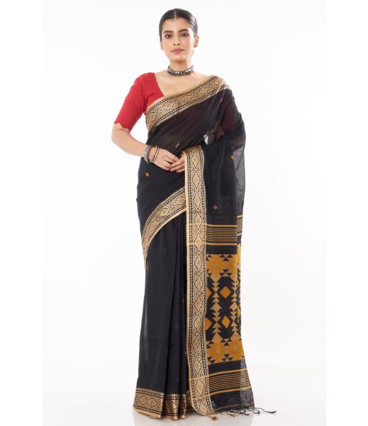 BLACK BODY HANDLOOM WEAVE, ALL OVER BUTA, YELLOW CONTRAST PALLU & BORDER, MATCHING BLOUSE PIECE