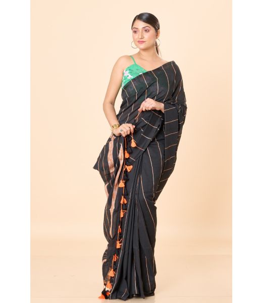 Product Description: Black Khesh Saree with Orange Tassels and Matching Blouse Piece