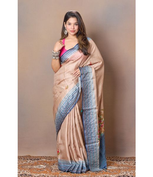 Elevate your ethnic wardrobe with this Handwoven Tussar Silk Saree highlighted by a deep Dark Blue contrast border. Known for its natural texture and soft golden sheen, tussar silk lends this saree a refined yet organic charm. The rich dark blue border creates a striking contrast, adding depth and contemporary elegance while preserving the saree’s traditional soul.