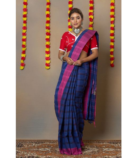Drape yourself in timeless sophistication with this Ink Blue Tone Pure Bengal Cotton Handloom Saree, beautifully contrasted with a dark pink border. Handwoven by skilled Bengal artisans, this saree embodies a perfect blend of depth and vibrancy — the calm allure of blue meets the bold charm of pink.