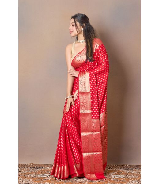 Make a striking statement with this Red Georgette Saree embellished with intricate full-body zari buta work. Crafted from soft, flowing georgette, the saree drapes beautifully, creating a graceful silhouette while the rich red hue radiates festive charm and timeless allure. The all-over zari buta motifs add a luxurious shimmer, enhancing the saree’s regal appeal without overpowering its elegance.