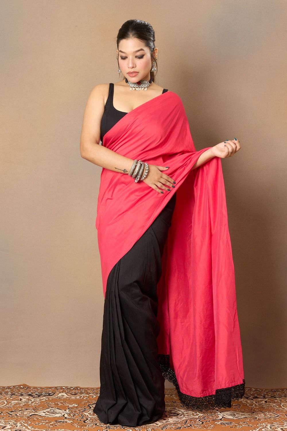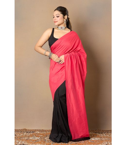 Make a bold yet timeless statement with this Red and Black Half-and-Half Handloom Cotton Saree, where tradition meets striking contrast. Carefully handwoven by skilled artisans, this saree beautifully balances the depth of classic black with the vibrancy of rich red, symbolising strength, grace, and cultural heritage. The clean division of colours creates a dramatic visual appeal while retaining the understated elegance of handloom craftsmanship.