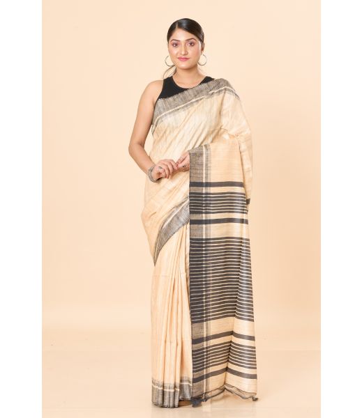 Product Name: Beige Ghicha Tussar Silk Saree with Subtle Black Border & Pallu