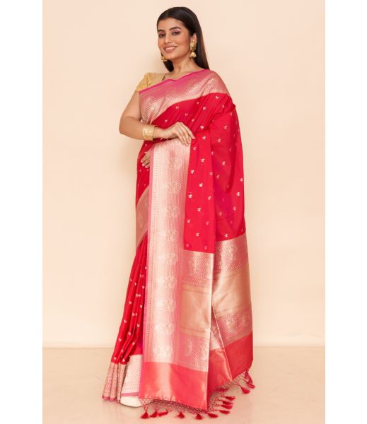 - Color: Vibrant pink base with a rich golden zari border and an intricately designed pallu, radiating opulence.