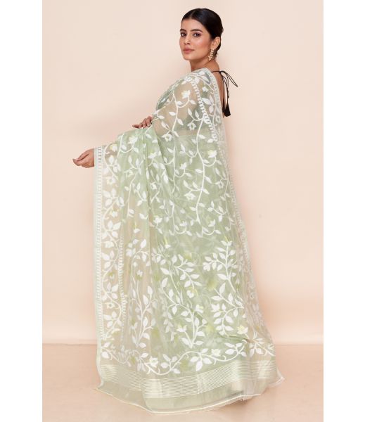 GREEN SOFT DHAKAI ALL OVER FLORAL THREAD WORK