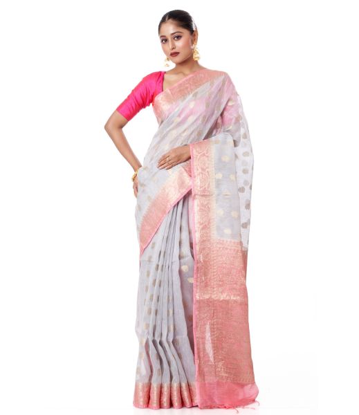 GREY BODY LINEN BANARASI WITH ALL OVER ZARI BUTA, PINK CONTRAST BORDER, AND CONTRAST PINK BLOUSE PIECE
