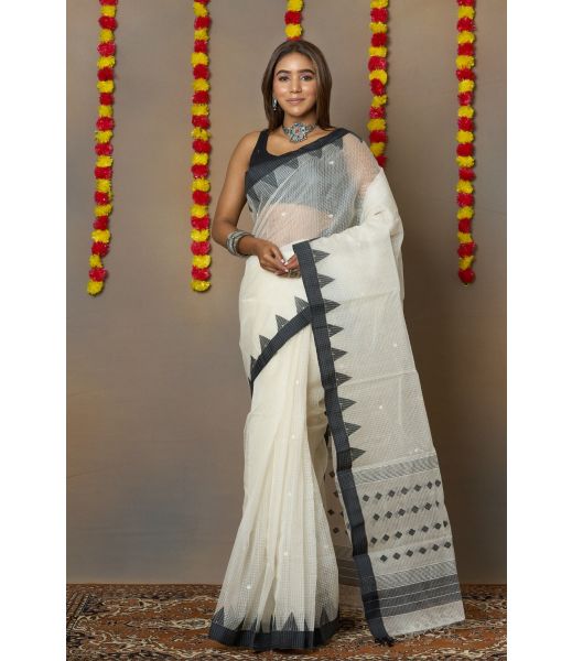The classic white body paired with a striking black border lends a timeless contrast, perfect for elegant day events or serene evening gatherings. Lightweight, breathable, and graceful — this saree embodies the essence of traditional Bengal artistry with a contemporary appeal.
