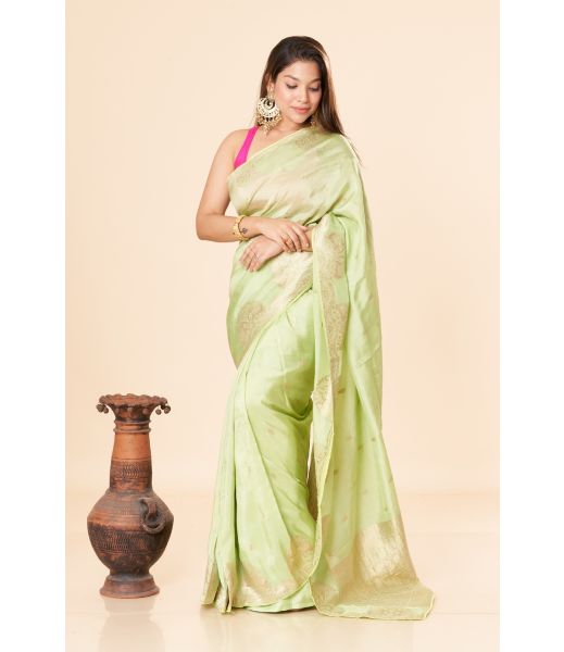 - 1 Pista Green Mashroo Satin Saree with Muted Golden Zari Threadwork.
