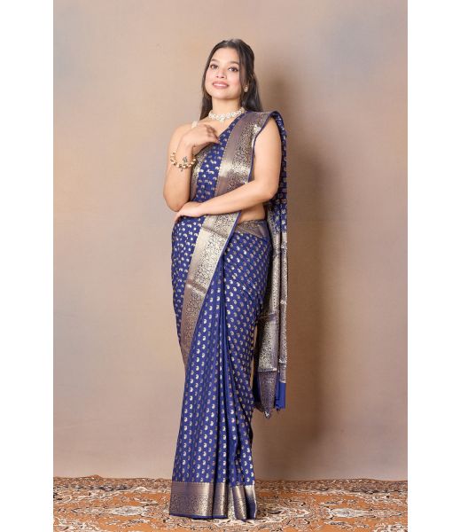 Elevate your occasion wardrobe with this Ink Blue Georgette Saree adorned with exquisite full-body zari buta work. The deep ink blue hue lends a rich, contemporary charm, while the soft georgette fabric ensures a fluid drape and effortless elegance. Intricately woven zari buta motifs shimmer subtly across the saree, adding a touch of regal opulence without overwhelming the refined silhouette.