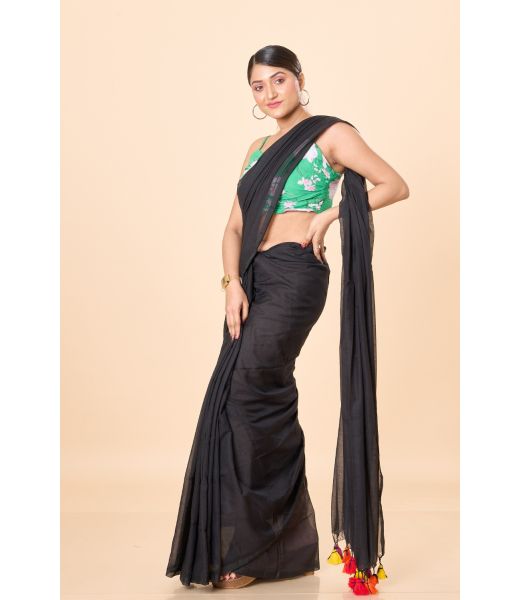 Product Description: Bengal Soft Mul Cotton Saree – Black with Colourful Tassels
