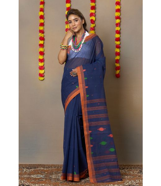 Design: Dark blue body with handwoven Jamdani motifs in fine threadwork