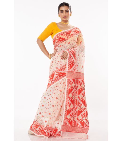 OFF WHITE BODY RED & GOLDEN ALL OVER THREAD WORK SOFT DHAKAI JAMDANI.