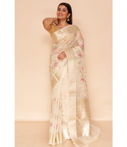 OFF WHITE ORGANZA WITH ALLOVER FLORAL EMBROIDERY ZARI PALLU