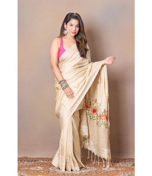 Experience understated luxury with this Off-White Tussar Silk Saree beautifully adorned with delicate embroidery. Woven from pure tussar silk, the saree showcases its signature natural texture and soft sheen, enhanced by intricate handcrafted embroidery that adds depth without overpowering its serene elegance.