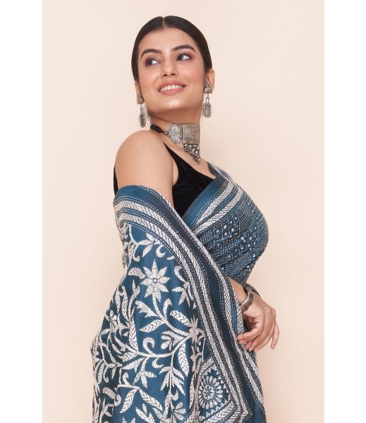 PINE GREEN (DUAL TONE) KATHA STITCH ON SILK, MATCHING BLOUSE PIECE