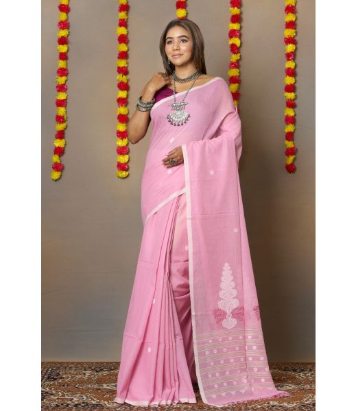 Delicate, graceful, and timeless — this Pure Cotton Handloom Baby Pink Saree is a true celebration of understated beauty. Handwoven by skilled Bengal artisans, it features elegant threadwork motifs that add a subtle charm to its soft pastel hue. Crafted from 100% pure cotton, this saree offers a light, airy texture and a comfortable drape, making it perfect for both casual and festive occasions.