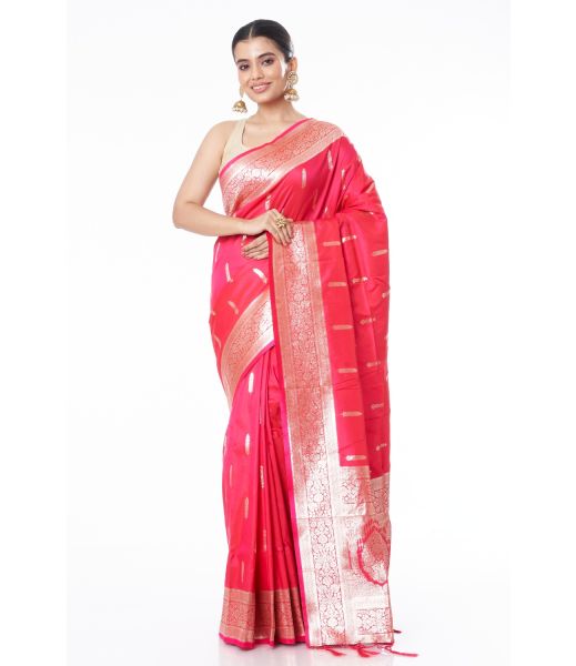 - Body: Rich pink base with intricate golden zari buttis spread evenly across.