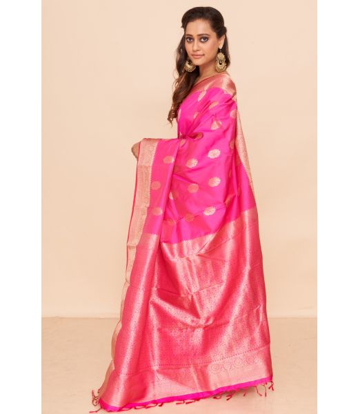 RANI PINK SOUTH SILK WITH ALL OVER GOLDEN ZARI WORK, MATCHING BLOUSE PIECE
