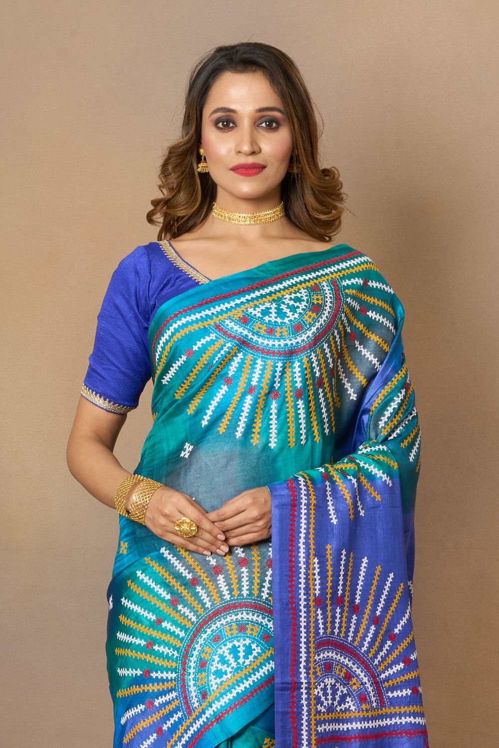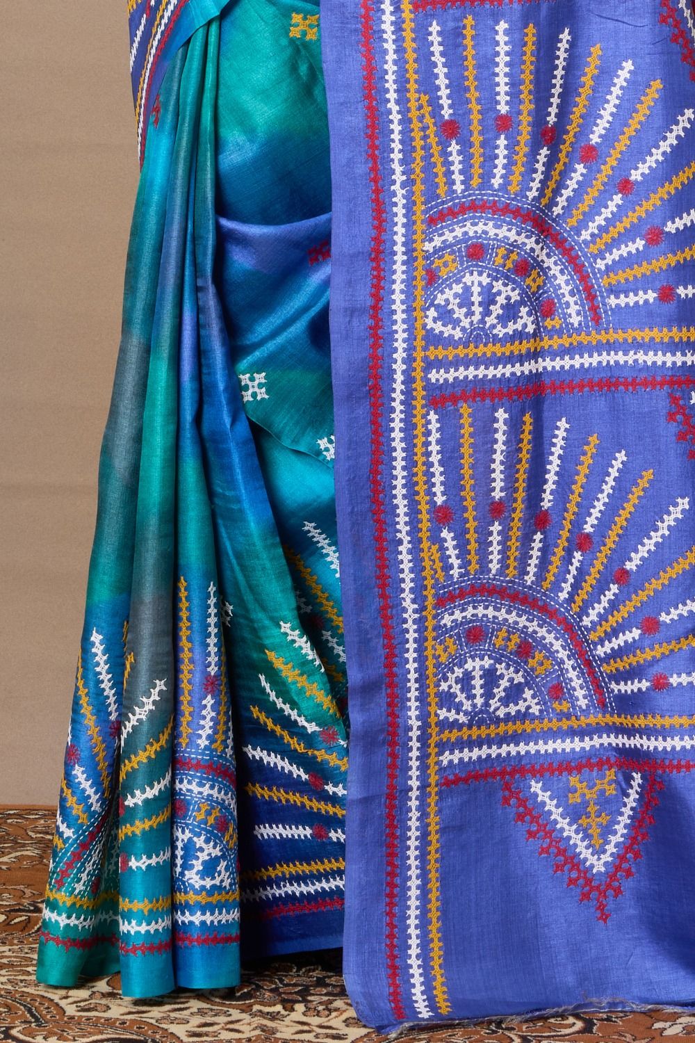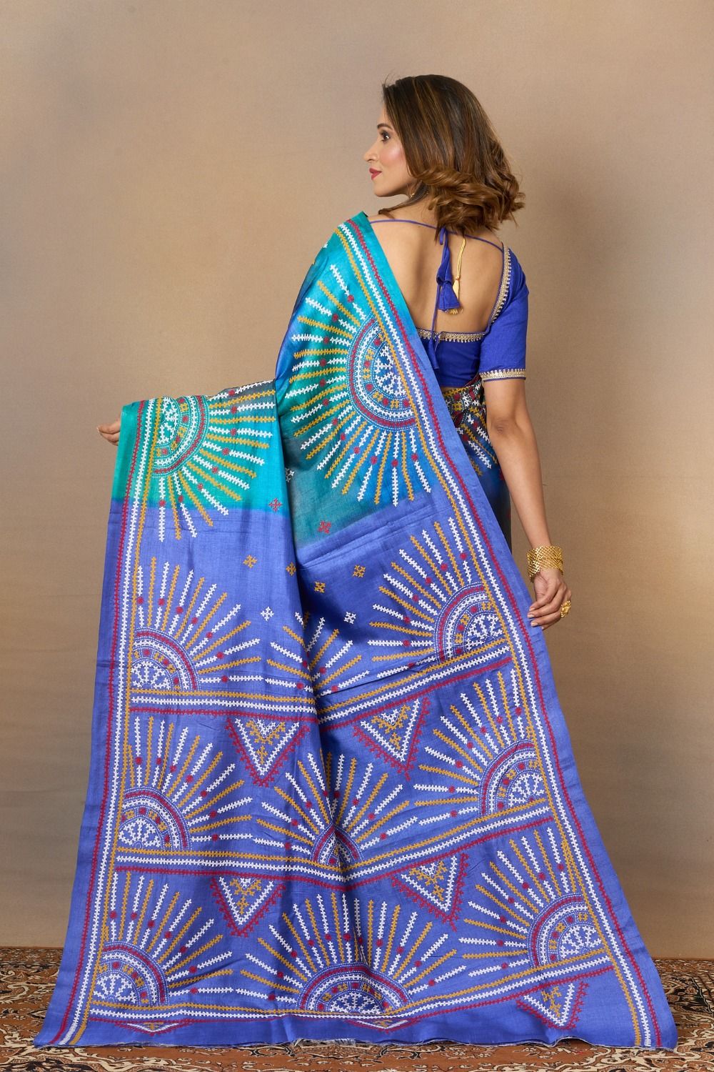 Rajwadi Peacock blue Resham Gujarati stitch pure silk saree