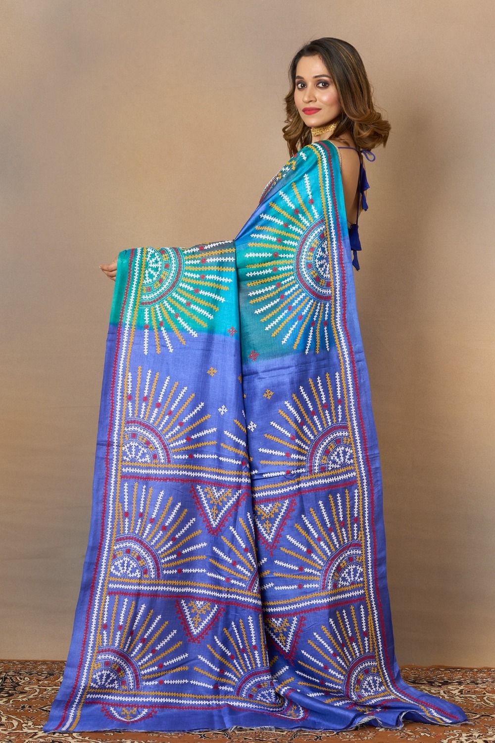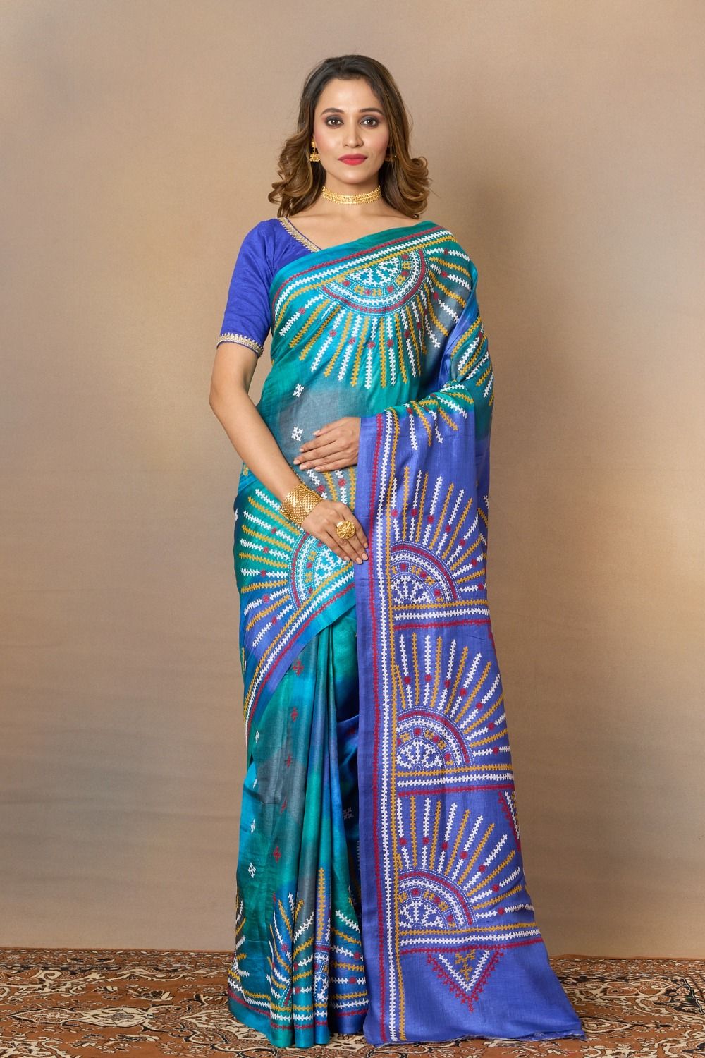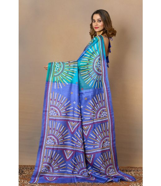 Rajwadi Peacock blue Resham Gujarati stitch pure silk saree