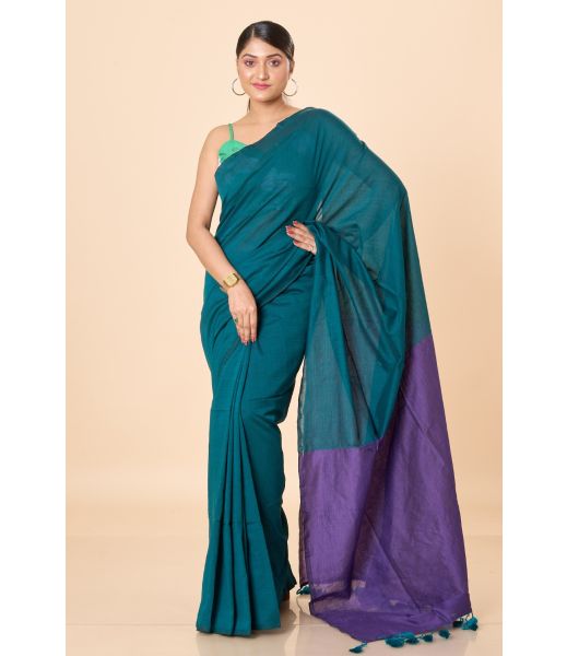 Product Description: Bengal Soft Mul Cotton Saree – Green & Violet with Violet Tassels