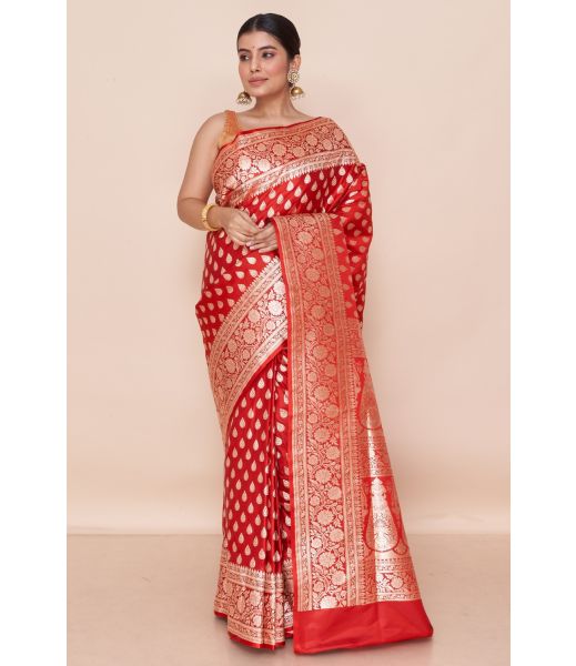 RED BENARASI WITH ALL OVER GOLD ZARI WORK, MATCHING BLOUSE PIECE