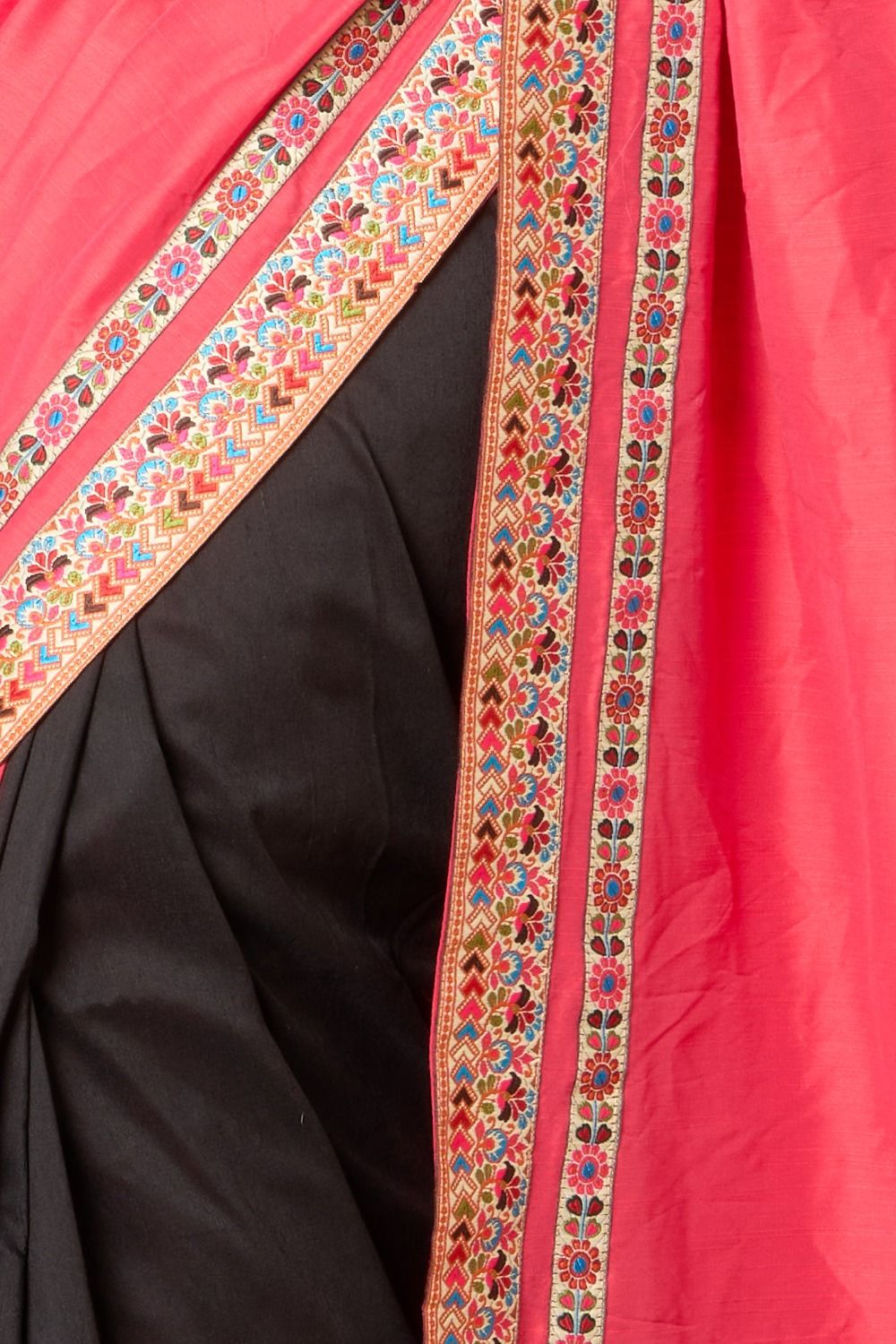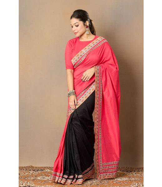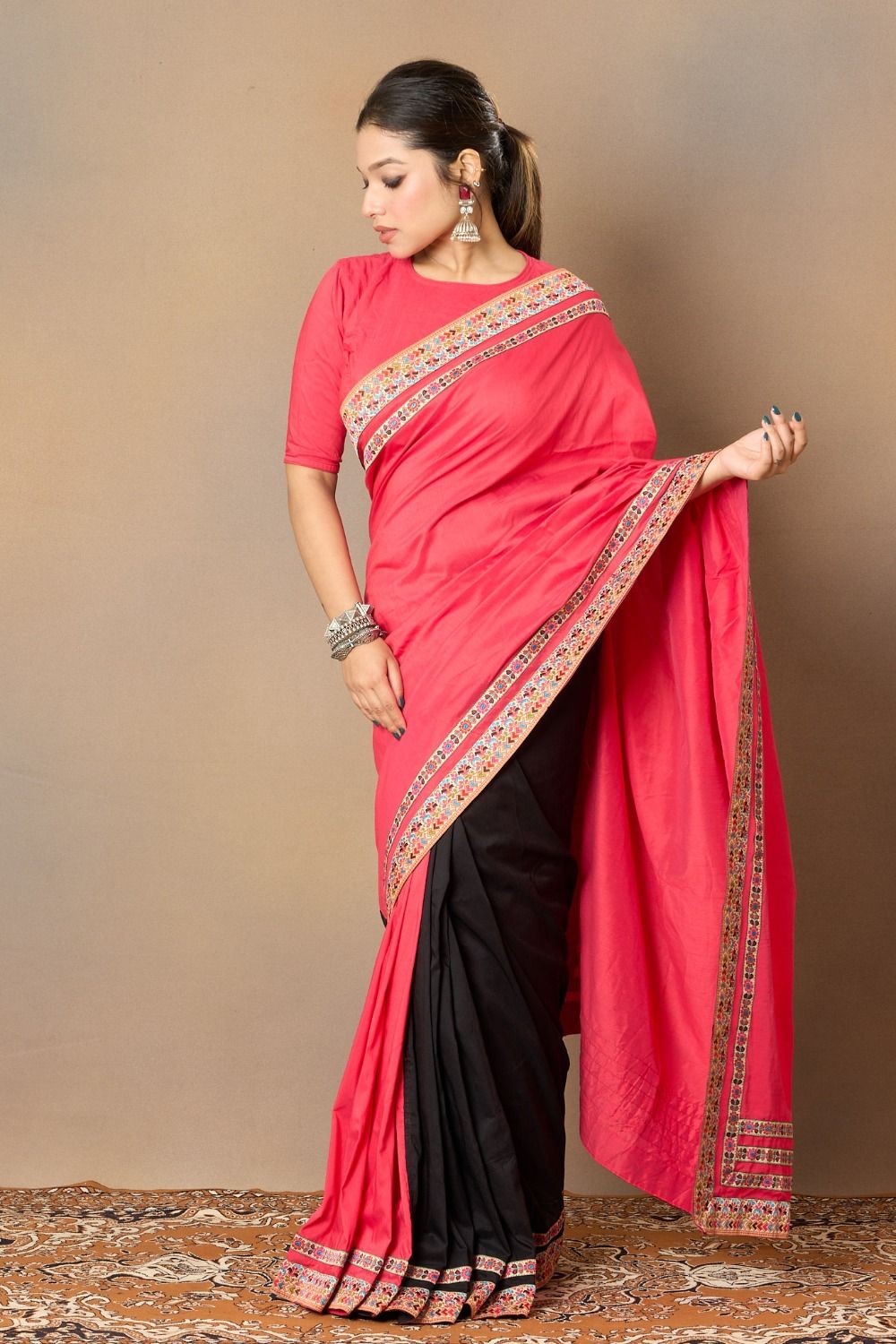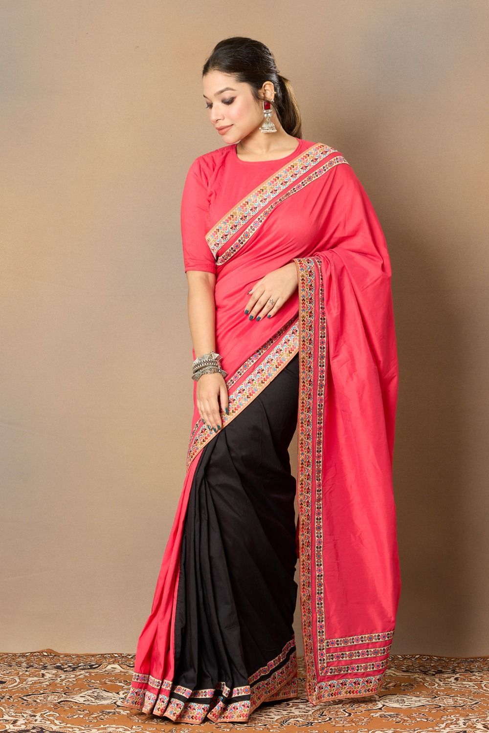 Bold meets heritage in this striking Black & Red Half-and-Half Saree adorned with exquisite Pashmina-inspired work. The deep black body creates a dramatic canvas, beautifully contrasted by a rich red half and intricate pashmina-style motifs that add depth, warmth, and artisanal charm. Thoughtfully crafted, this saree reflects timeless craftsmanship while making a powerful contemporary statement.