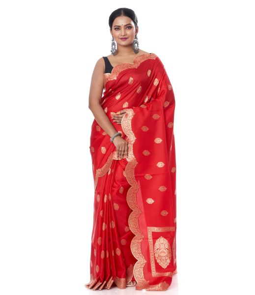 - Body: Rich, vibrant red adorned with intricate gold zari motifs.