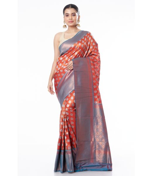 RUST ORANGE KATAN TISSUE WITH ALL OVER COPPER ZARI BUTA, CONTRAST COPPER ZARI BORDER, PALLU & BLOUSE PIECE