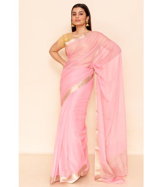Blush Breeze Pink Chiffon Saree WITH ZARI, MATCHING BLOUSE PIECE