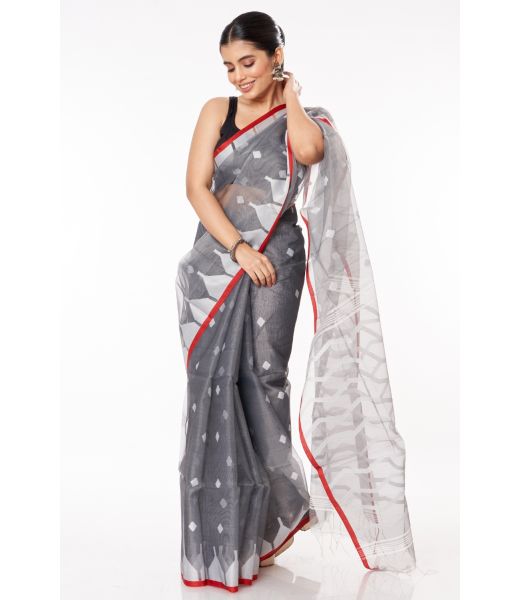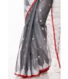 SOFT GREY DHAKAI MUSLIN, ALL OVER THREAD WORK, NARROW RED BORDER, WITH MATCHING BLOUSE PIECE
