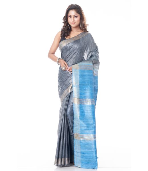 STEEL GREY BODY GHICHHA TUSSAR, WITH ZARI BORDER, CONTRAST BLUE PALLU & BLOUSE PIECE