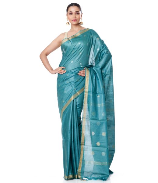 TEAL BLUE TUSSAR SILK, ALL OVER ZARI BUTA AND ZARI BORDER, MATCHING BLOUSE PIECE
