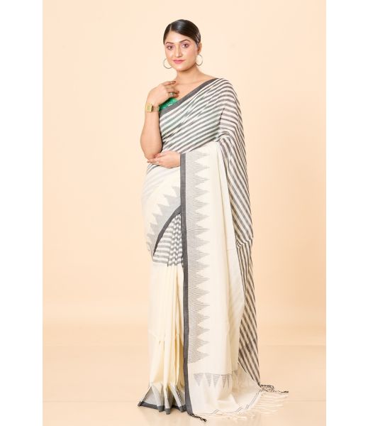 Product Description: Bengal Handloom Saree – Beige/Off-white with Light Black Temple Border