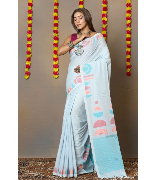 Made from 100% pure cotton, it offers a soft, airy texture — perfect for warm climates and long wear. The lively threadwork across the borders and pallu creates a subtle yet striking contrast against the serene blue base, making it an ideal choice for both festive occasions and everyday sophistication.