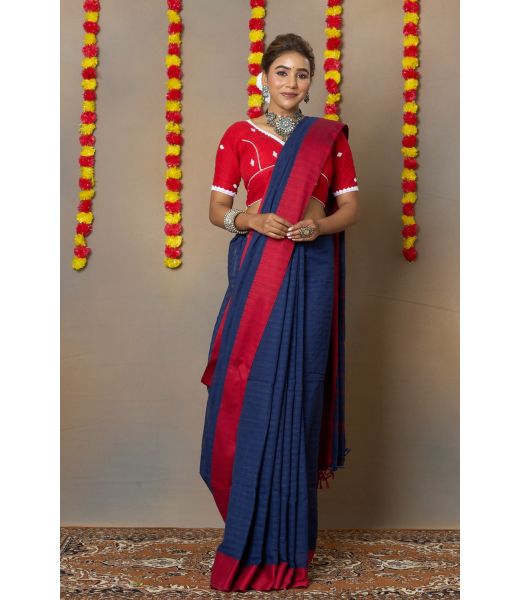 Design: Solid ink blue body with contrasting red woven border and pallu