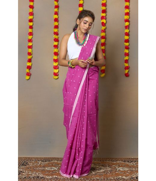 Immerse yourself in the charm of traditional artistry with this Bright Purple Pure Bengal Cotton Handloom Saree, exquisitely adorned with white threadwork. Handwoven by Bengal’s master weavers, this saree is a celebration of vibrant hues and intricate craftsmanship. The striking contrast of pure white embroidery against the rich purple base exudes both elegance and energy — perfect for women who carry tradition with confidence and grace.