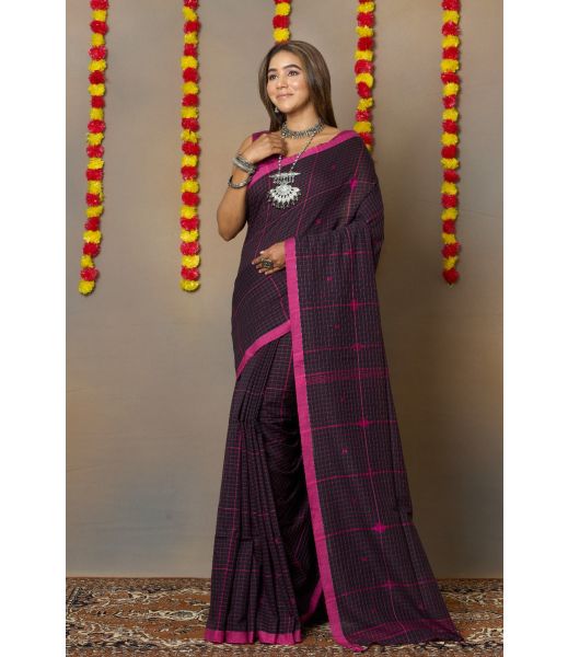 Timeless, elegant, and artistically woven — this Pure Cotton Black Bengal Handloom Saree with Purple Threadwork is a stunning fusion of tradition and modern poise. The deep black body symbolizes classic sophistication, while the intricate purple thread motifs add a touch of regal charm.