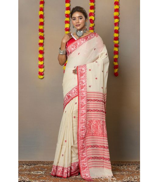 Ethereal and timeless, this Off-White Tone Pure Bengal Cotton Handloom Saree with Red Threadwork is a true expression of Bengal’s understated elegance. Handwoven by master artisans, the saree captures the purity of off-white cotton adorned with intricate red thread motifs — a combination that symbolizes both grace and power.