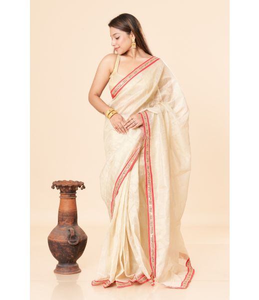 Product Description: Golden Tissue Silk Saree with Contrast Red Border