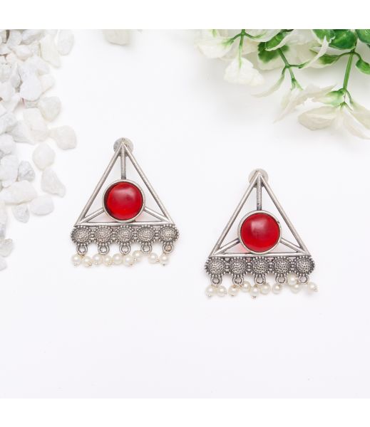 Triangle-shaped silver-tone earrings with bold red circular stone at the center