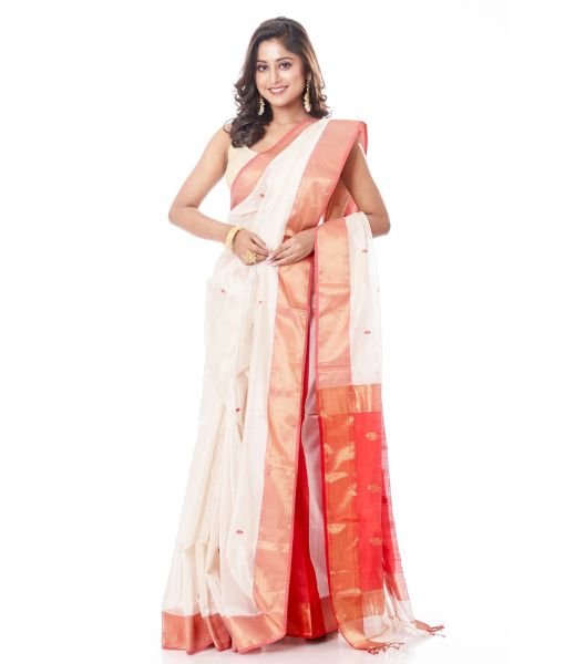 WHITE MAHESHWARI WITH RED BUTA ALL OVER BODY, RED CONTRAST PALLU & BORDER, CONTRAST BLOUSE PIECE